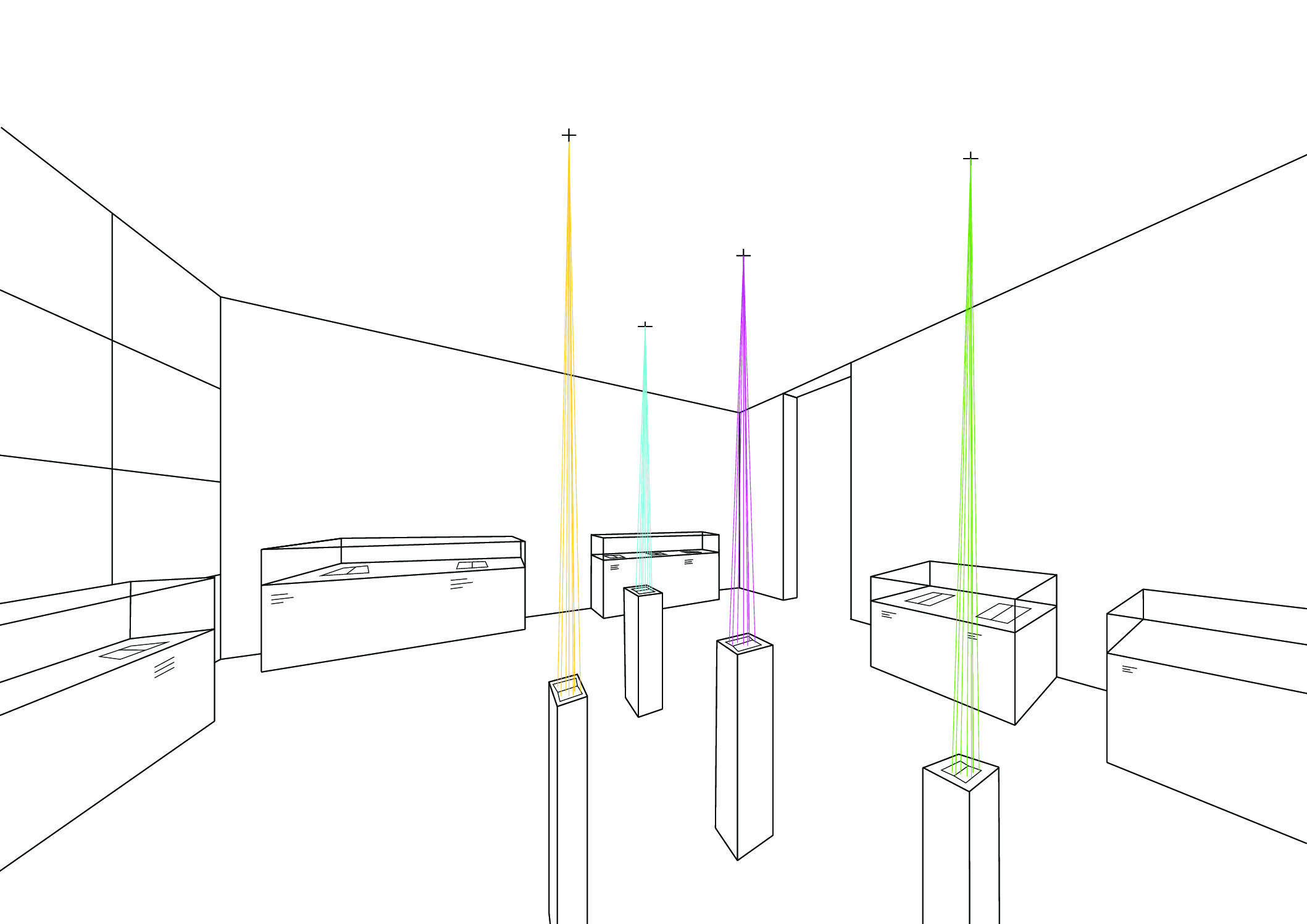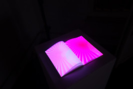 Da CoCB als ein interdisziplinäres Projekt arbeitet soll im Museumsraum des Museum Angewandte Kunst Frankfurt a.M. ein Ort geschaffen werden, der nur für Ausstellungen aus der Sammlung genutzt wird. Bei der Ausstellung von Büchern und Grafiken stößt man allerdings auf viele konservatorische Probleme, weshalb die Bücher nur in Vitrinen ausgestellt werden können. Daher habe ich ein Raumkonzept entwickelt, dass es ermöglicht sowohl die Originalwerke zu betrachten, als auch in den Werken selbst zu blättern. Zusätzlich im Raum werden Podeste mit »leeren« Büchern verteilt. Zu jedem Original gibt es ein Buch ohne Layout. Als Beispiel dient das Buch »Attraction« aus der »Enzyklopädie des Imaginären« von Lilian Lautenschläger. Mit Hilfe eines Beamers können die Repro-Aufnahmen auf die leeren Seiten projiziert werden. Mit Hilfe von Sensoren erkennt der Beamer in welcher Position sich die Hand des Besuchers befindet, und projiziert damit beim Umblättern der Seite eine neue Seite. Dieses Prinzip konnte ebenfalls in der Ausstellung erlebt werden.