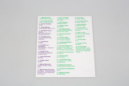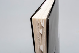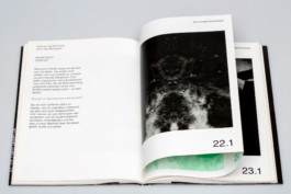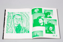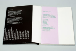 Das Gesamtthema führte uns zu Chromolux-Papier mit einer ungestrichenen Rückseite und einer glänzenden Vorderseite. Eine japanischer Bindung ermöglichte es uns, den Gedanken von »der Rückseite der Dinge«, die für den Betrachter einfach unsichtbar sind, wörtlich zu übersetzen. Auf der Innenseite risoprintierten wir Bilder des Diplomprozesses und ein Porträt, je nach Studiengang entweder in Violett oder Grün. Und auf der Außenseite ein schlichtes Schwarz-Weiß-Bild des »glänzenden« Ergebnisses mit seiner Beschreibung.